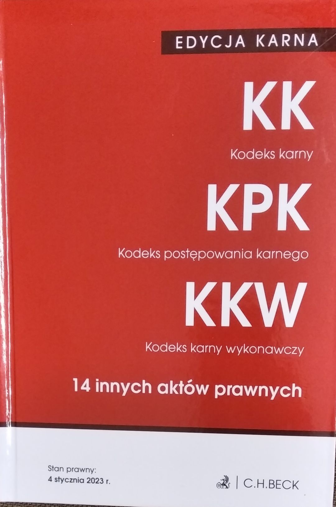 KK - Kodeks karny. KPK - Kodeks postępowania karnego. KKW - Kodeks karny wykonawczy : 14 innych aktów prawnych. - 45. wydanie, stan prawny: 4 stycznia 2023 r. (obejmuje zmiany wchodzące w życie: 13.2.2023 r. (Dz.U. z 2021 r. poz. 2427), 14.3.2023 r. (Dz.U. z 2022 r. poz. 2600), 18.5.2023 r. (Dz.U. 2022 r. poz. 2339), 14.12.2023 r. (Dz.U. z 2022 r. poz. 2600), 1.1.2026 r. (Dz.U. z 2022 r. poz. 2600), 18.4.2026 r. (Dz.U. z 2015 r. poz. 1634) - w podwójnym stanie prawnym. - Warszawa : C. H. Beck, 2023. - XV, [1], 1294, [2] strony ; 22 cm.