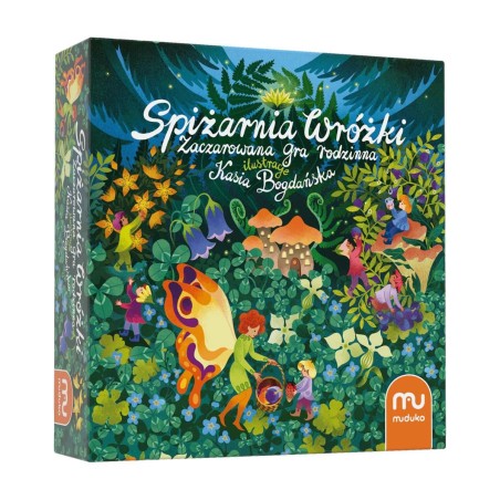 Spiżarnia wróżki : zaczarowana gra rodzinna / ilustracje Kasia Bogdańska ; [autor gry: Sylwia Bogdańska. - Podłęże : Muduko, 2024. - 1 gra (magiczny zegar, 4 planszetki, 36 kart, 4 tafelki skrzatów, 4 koszyczki, 40 żetonów, 2 kostki) : karton, plastik, kolor) ; w pudełku 23x7x7 cm + instrukcja (8 stron : ilustracje kolorowe ; 22 cm).