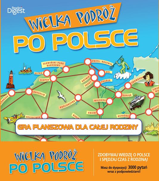 Gra planszowa Wielka podróż po Polsce przeznaczona jest dla wszystkich miłośników podróży po Polsce, dla tych, którzy lubią podróżować także palcem po mapie, oraz tych, którzy o Polsce wiedzą sporo, a chcieliby wiedzieć jeszcze więcej. Co jest symbolem Tatrzańskiego Parku Narodowegoa Jaka góra jest dla Ślązaków miejscem świętyma W jakiej miejscowości przechowywane są relikwie świętego Walentegoa Gdzie znajduje się arboretum, w którym rosną trzy słynne dęby Lech, Czech i Rusa Jak nazywa się zaopatrzony w pęcherze pływne brunatny glon, wyrzucany przez fale na bałtyckie plażea Gdzie znajduje się klasztor Cystersów, w którym przechowywany jest jedyny w Polsce egzemplarz Biblii Gutenbergaa W którym roku koronował się Bolesław Chrobrya Kto w 1976 roku, w wieku 88 lat, został prezydentem RP na uchodźstwiea W którym roku miała miejsce pierwsza pielgrzymka Jana Pawła II do krajua Wielka podróż po Polsce to wspaniała zabawa dla całej rodziny. To wyprawa, podczas której przemierzamy Polskę wzdłuż i wszerz. Poznajemy historię, przyrodę i kulturę naszego kraju, spotykamy wybitnych uczonych oraz artystów i ich dzieła, oglądamy najpiękniejsze miasta. To doskonała rozrywka na długie zimowe wieczory, a także wspaniały trening teoretyczny przed wiosenno-letnimi wędrówkami po kraju.